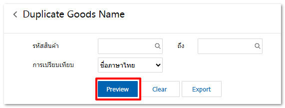 3. เมื่อเลือกช่วงรายงานเสร็จแล้วกดปุ่ม Preview ระบบจะแสดงรายชื่อสินค้าซ้ำ ตามรูปแบบรายงานที่ได้เลือก