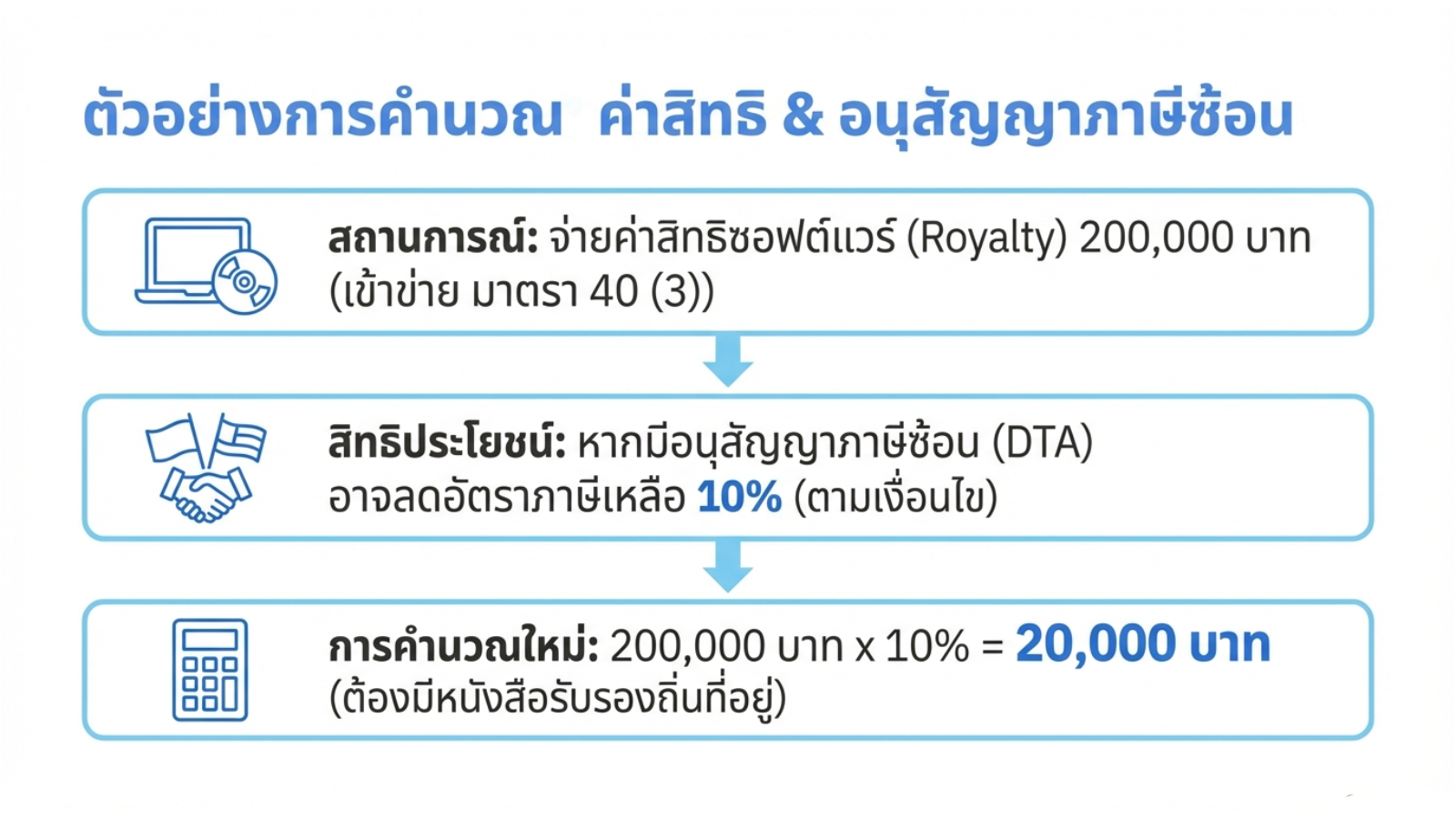 บริษัทไทยจ่ายค่าสิทธิในการใช้ซอฟต์แวร์แก่บริษัทต่างประเทศ จำนวน 200,000 บาท ซึ่งเข้าลักษณะมาตรา 40 (3) โดยหลักทั่วไป ต้องหักภาษีในอัตราร้อยละ 15 ตามมาตรา 70 อย่างไรก็ดี หากประเทศของผู้รับมีอนุสัญญาเพื่อการเว้นการเก็บภาษีซ้อนกับประเทศไทย และกำหนดให้อัตราภาษีสูงสุดสำหรับค่าสิทธิไม่เกินร้อยละ 10 ผู้จ่ายเงินอาจใช้อัตราดังกล่าวได้