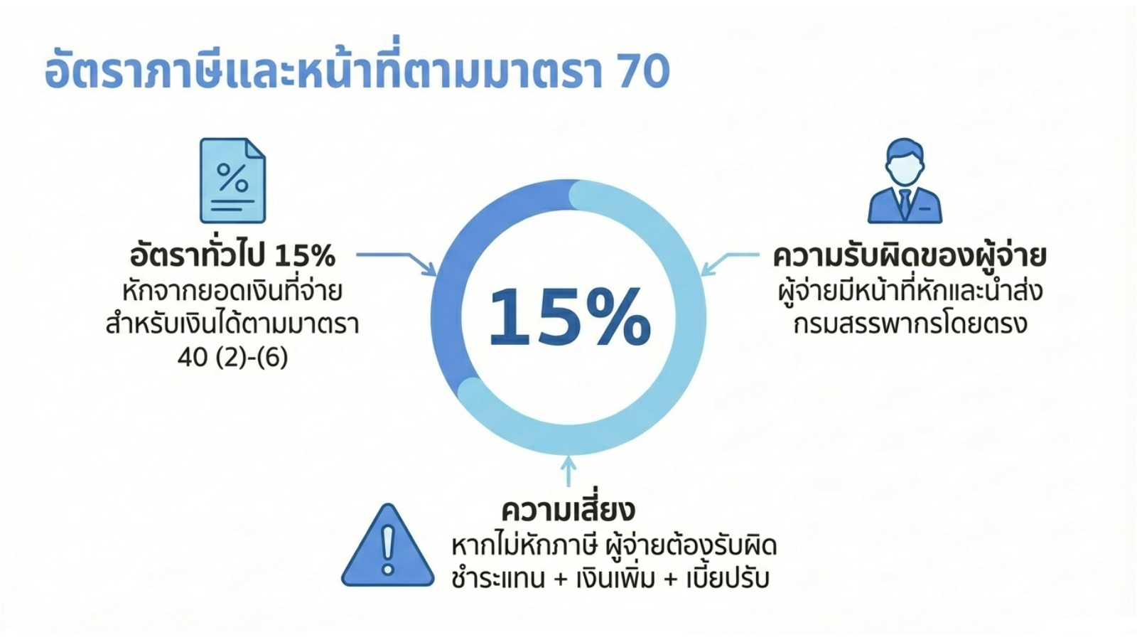 มาตรา 70 บัญญัติว่า เมื่อมีการจ่ายเงินได้ตามมาตรา 40 (2) (3) (4) (5) หรือ (6) ให้แก่บริษัทหรือห้างหุ้นส่วนนิติบุคคลที่ตั้งขึ้นตามกฎหมายต่างประเทศ และมิได้ประกอบกิจการในประเทศไทย ให้ผู้จ่ายเงินหักภาษี ณ ที่จ่ายในอัตราร้อยละ 15 ของจำนวนเงินที่จ่าย เว้นแต่กรณีที่กฎหมายกำหนดไว้เป็นอย่างอื่น