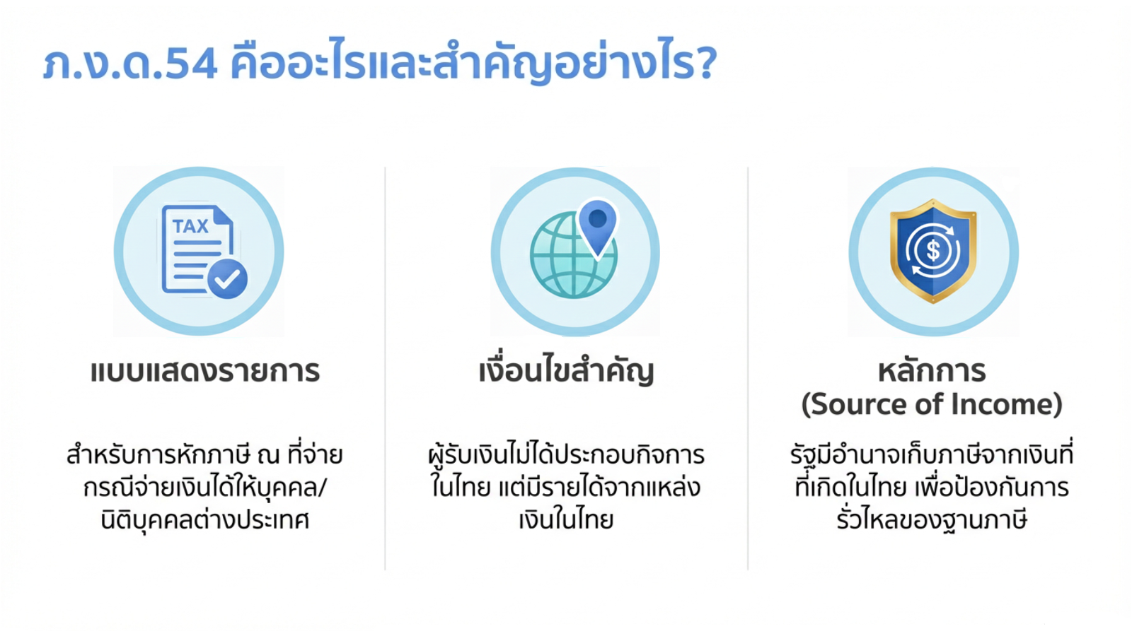 ภ.ง.ด.54 เป็นกลไกสำคัญในระบบภาษีอากรของประเทศไทยที่ใช้บังคับกับการจ่ายเงินได้ไปต่างประเทศ โดยอาศัยหลักเกณฑ์ตามมาตรา 40 มาตรา 41 และมาตรา 70 แห่งประมวลรัษฎากร