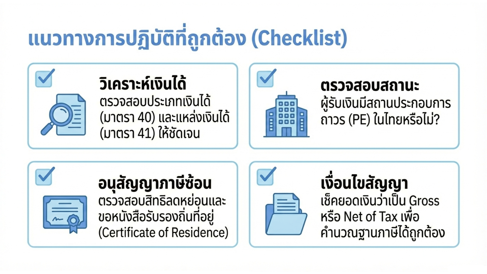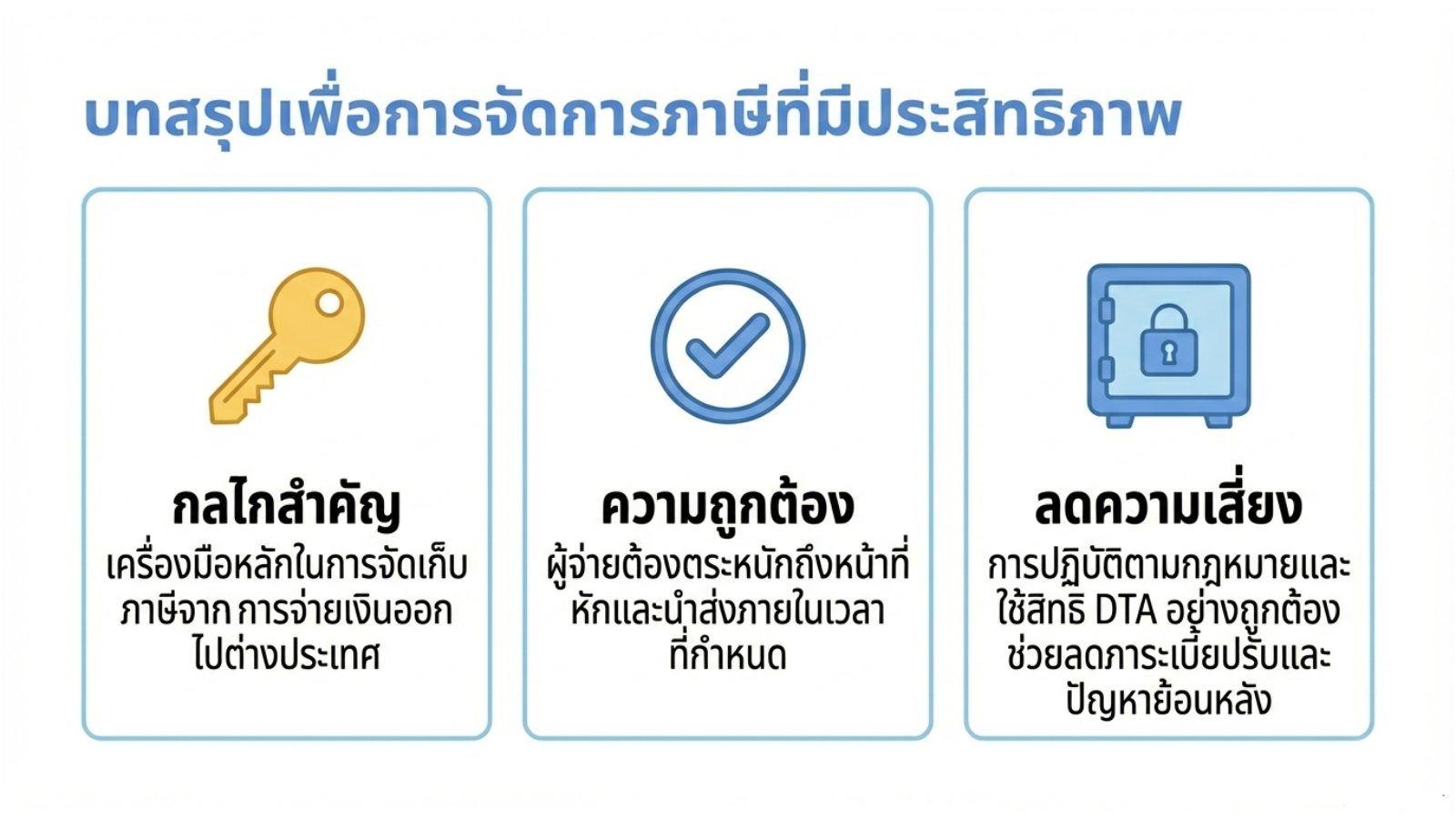ผู้จ่ายเงินในประเทศไทยต้องตระหนักถึงหน้าที่ในการหักและนำส่งภาษีอย่างถูกต้องภายในกำหนดเวลา พร้อมทั้งพิจารณาสิทธิประโยชน์ตามอนุสัญญาภาษีซ้อนอย่างรอบคอบ การปฏิบัติที่สอดคล้องกับบทบัญญัติกฎหมายและแนวทางของกรมสรรพากร จะช่วยลดความเสี่ยงทางภาษี และสนับสนุนการดำเนินธุรกรรมระหว่างประเทศให้เป็นไปอย่างมั่นคงและโปร่งใส