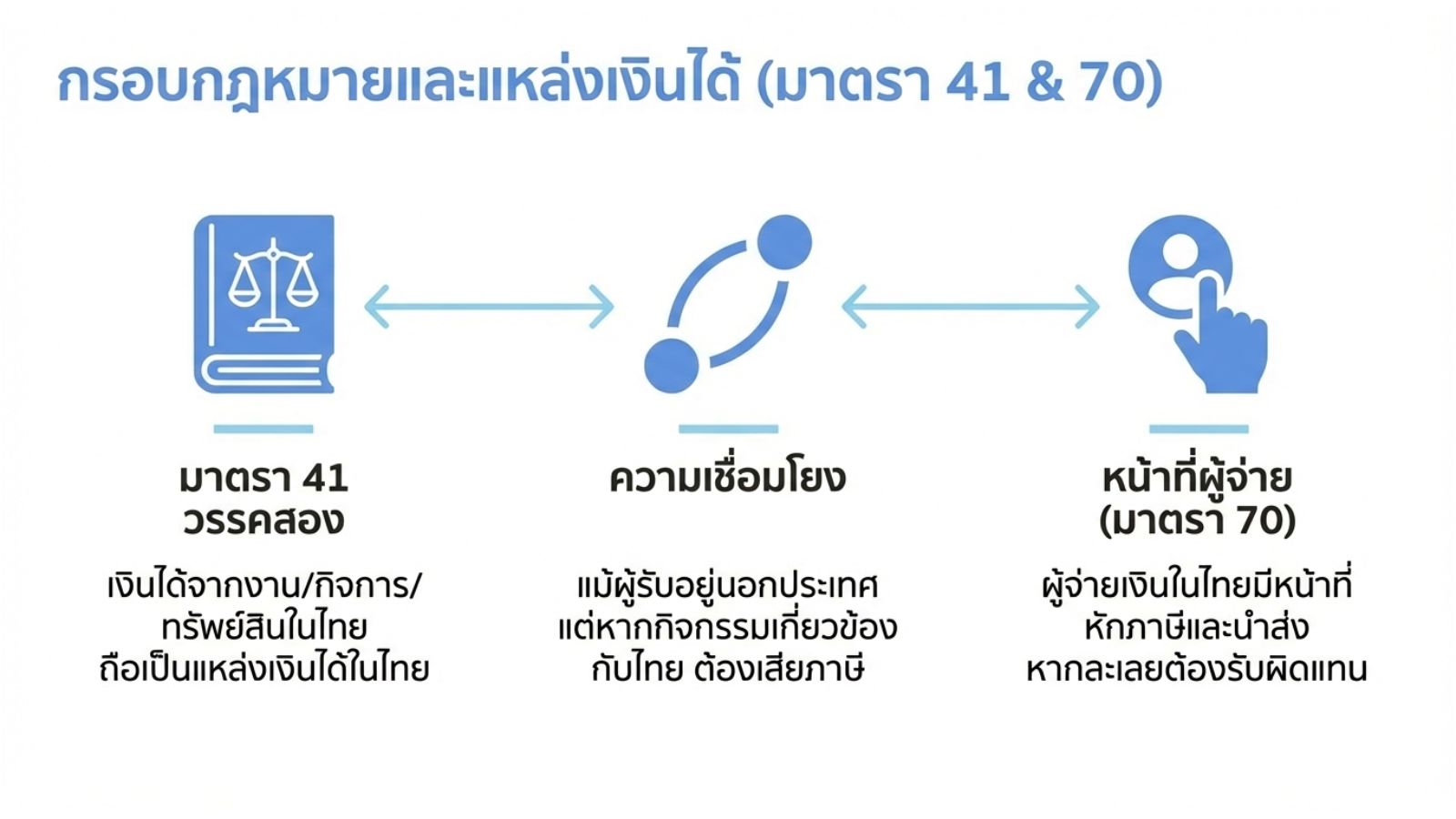 • มาตรา 41 วรรคสอง วางหลักเกณฑ์เกี่ยวกับแหล่งเงินได้ในประเทศไทย