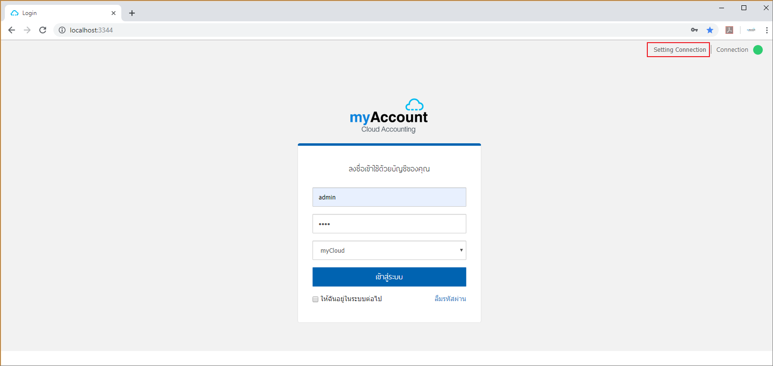1. ระบบจะแสดงหน้าต่าง Login ขึ้นมา จากนั้นให้ผู้ใช้คลิกปุ่ม “Setting Connection” เพื่อทำการเชื่อมต่อฐานข้อมูลกับโปรแกรมบัญชีออนไลน์ myAccount Cloud